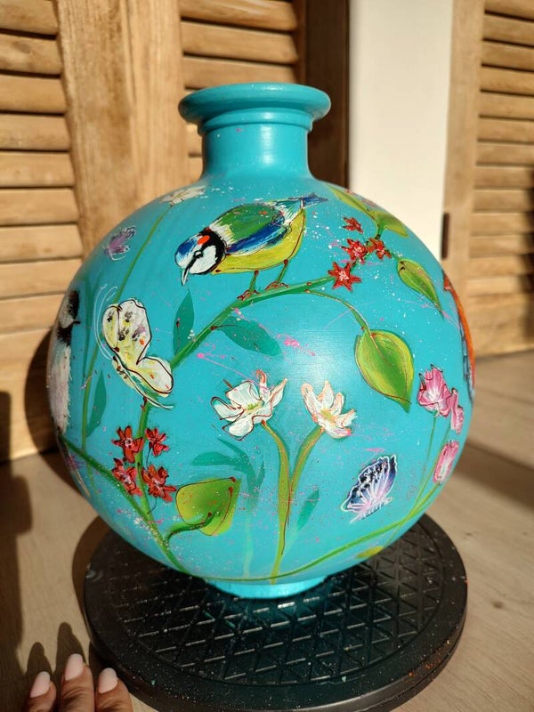 Deze mooie volle vaas is een echte eyecatcher in opvallende kleuren. Rondom heb ik 6 vogels geschilderd in een techniek die ik niet eerder gebruikte. Daarom heeft deE vaas ook een compleet andere stijl als dat je van mij kan verwachten.